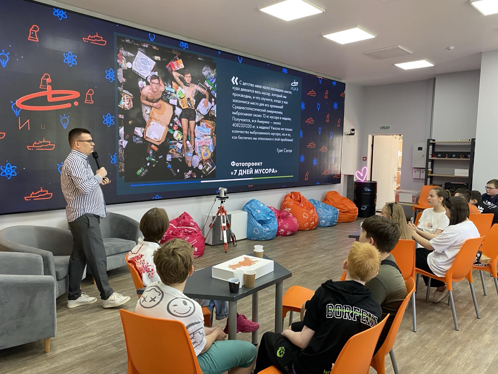 Руководитель ИЦАЭ Кирилл Губин рассказал ребятам об осознанном потреблении товаров. Для начала он привел данные о количестве мусорных свалок, которые находятся на территории России. Их совокупная площадь составляет территорию размером с Швейцарию. На огромном, во всю стену, экране, мелькали цифры и диаграммы, свидетельствующие о негативных последствиях деятельности человека на окружающую среду.
