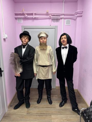 В День Гимназии в гримерную комнату ОДК мы пришли задолго до начала концерта, и профессиональный гример наклеила нам бороды, бакенбарды, надела парики и театральные костюмы. Нас было просто не узнать!
